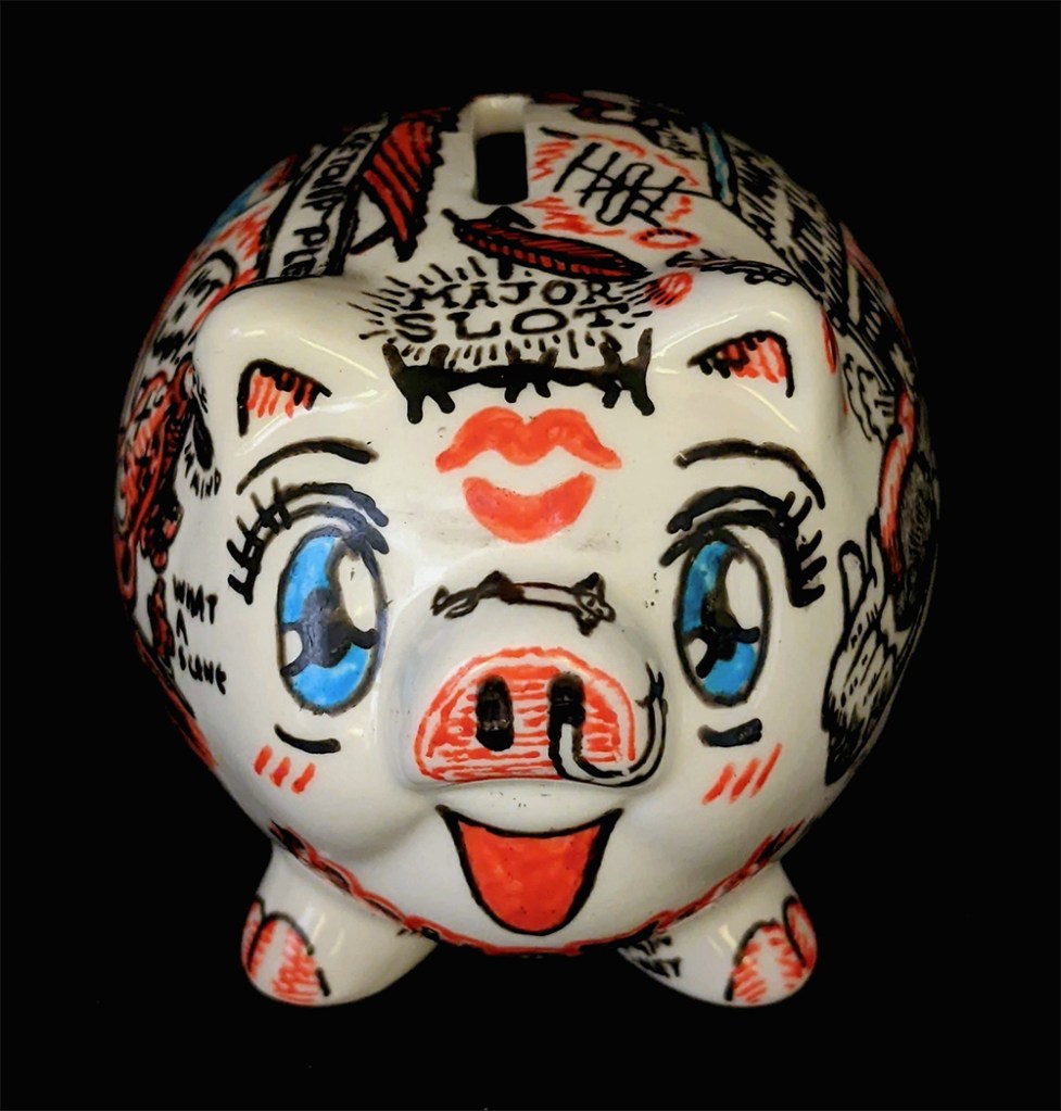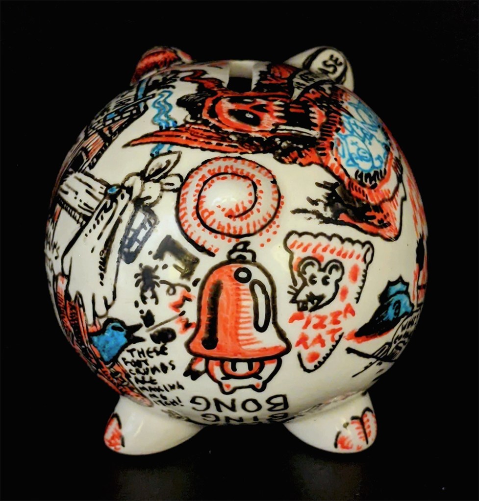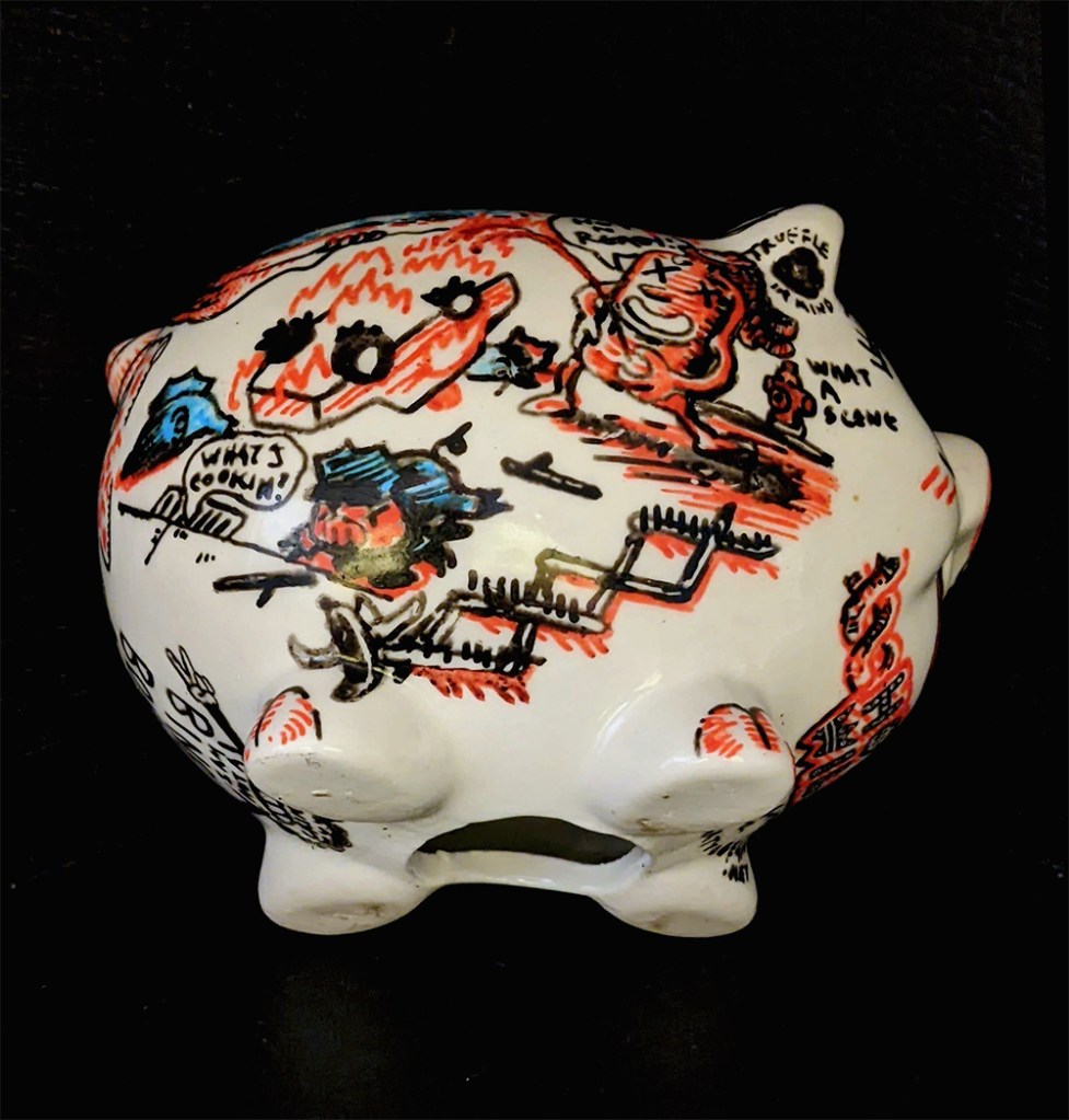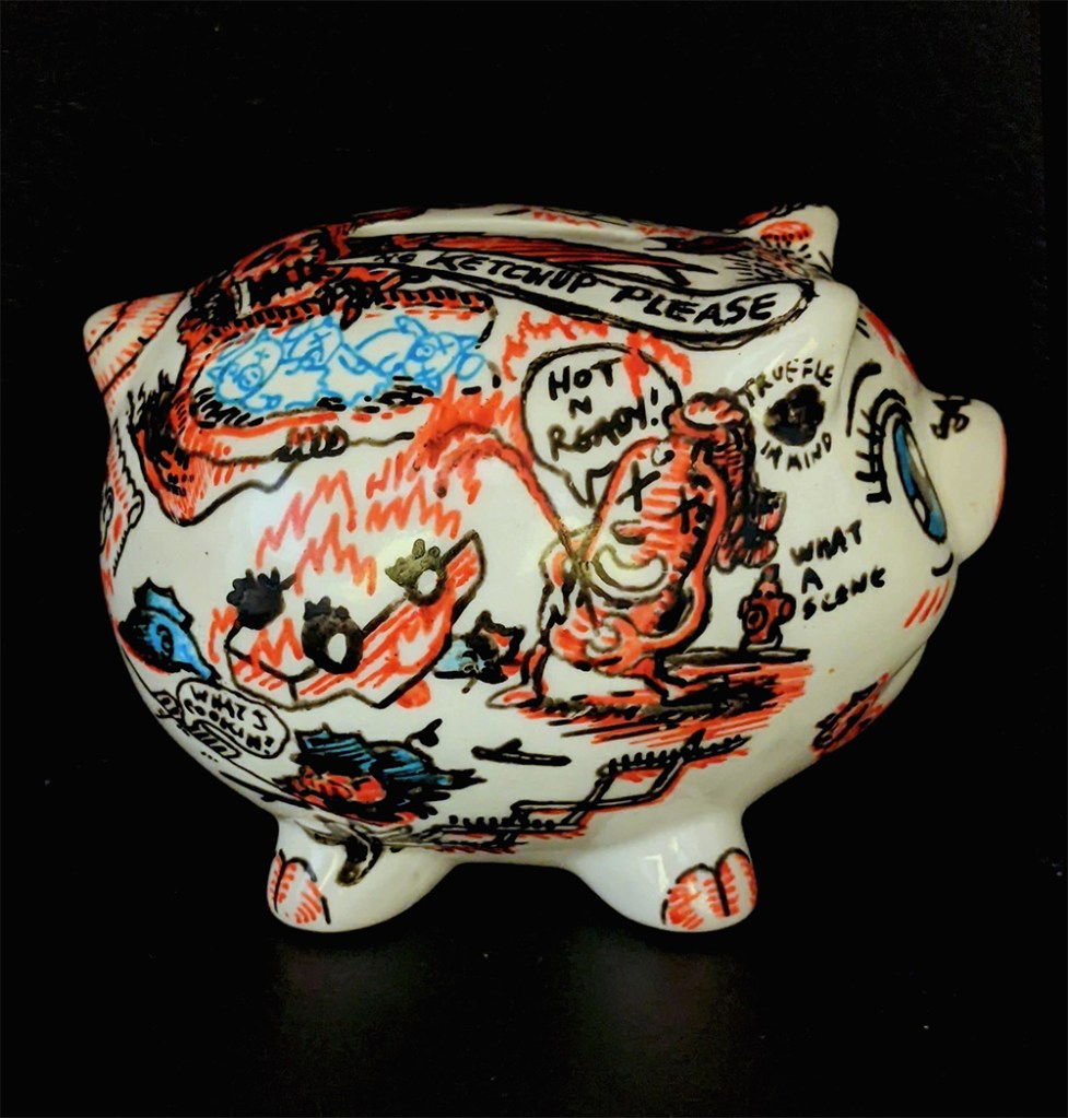 Hog Wild 3D, Drawings Porcelain paint on found ceramic piggy bank Share this: Click to share on Facebook (Opens in new window) Facebook Click to email a link to a friend (Opens in new window) Email Click to share on Reddit (Opens in new window) Reddit More Click to share on X (Opens in new window) X Click to share on Tumblr (Opens in new window) Tumblr Click to share on Pinterest (Opens in new window) Pinterest Like Loading...